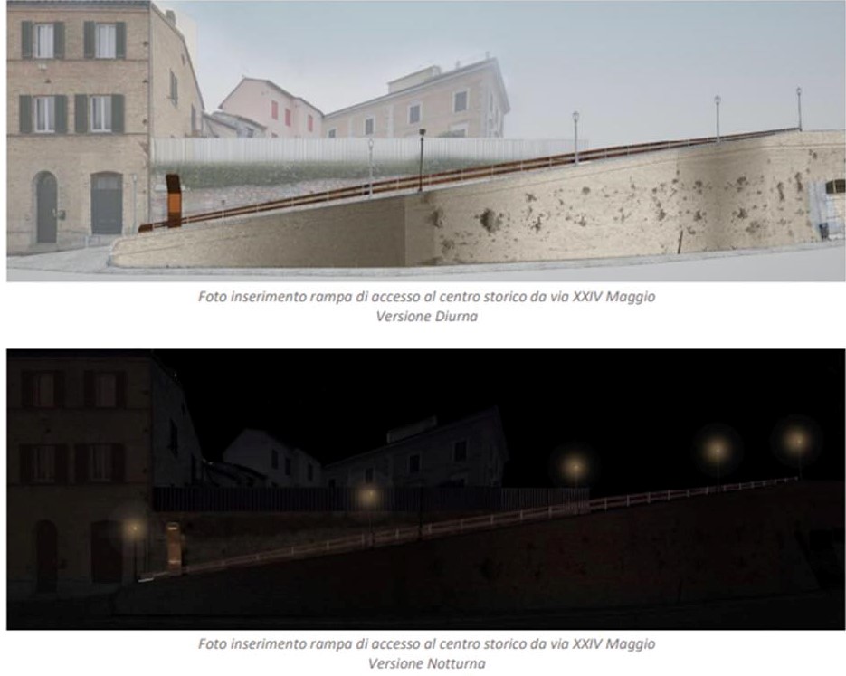 Nello specifico, l’intervento è finalizzato alla riqualificazione e messa in sicurezza della rampa Mirasole di accesso al Castello, principale accesso veicolare e pedonale. «Verrà infatti adeguato il parapetto all’attuale normativa, aggiungendo un elemento strutturale che consentirà di avere un’altezza utile pari ad 1.00 m lineare tale da prevenire eventuali cadute o incidenti. – specificano Grillini e Berionni – Il nuovo accesso sarà altresì valorizzato da una illuminazione a led, che guiderà il cittadino e il visitatore nell’accesso notturno al centro storico e che intende da un lato mettere in risalto il nuovo intervento, dall’altro valorizzare tramite contrasto l’esistente accesso in muratura.