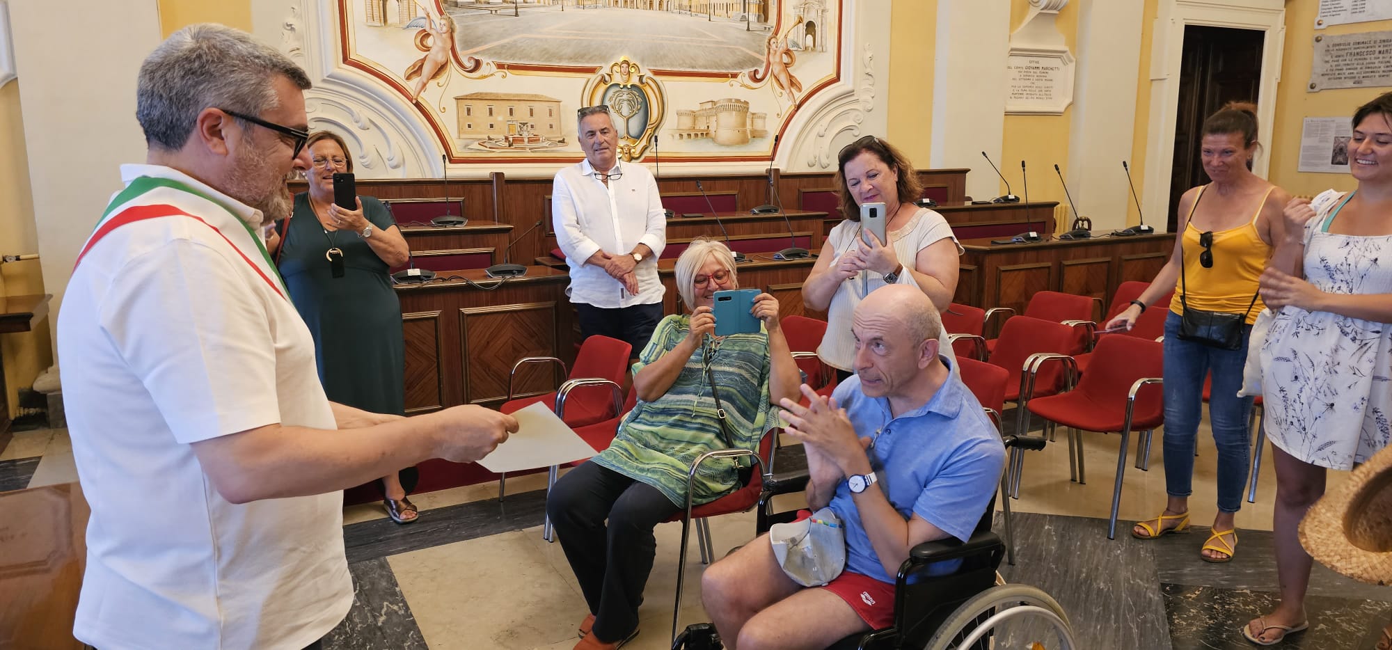 Foto ricordo a palazzo comunale per il turista Luigi Ciccarello che da 36 anni sceglie Senigallia per le sue vacanze estive