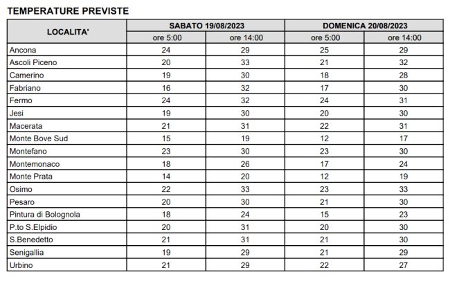 La Protezione civile – Centro Funzionale della Regione Marche conferma che oggi, 18 agosto, il cielo sarà sereno o poco nuvoloso per sviluppo di cumuli sulle zone appenniniche, con brevi rovesci o isolati temporali che nel primo pomeriggio potrebbero interessare il settore montano centro-meridionale, in spostamento verso l’Umbria. Il mare, quasi calmo al mattino, potrebbe diventare poco mosso nel primo pomeriggio con brezza. Per Ancona i 23 gradi di questa mattina cederanno il passo ai 30 delle ore 14 ma saranno percepiti per l’afa come 33, a Fabriano i 17 gradi della minima saliranno a 32 nelle ore calde della giornata e così a Jesi (20-33); Osimo (22-33) e Senigallia (19-29).