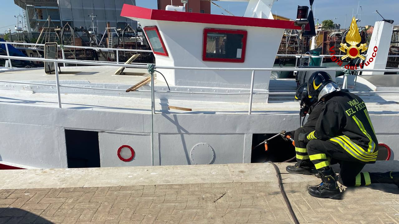 I vigili del fuoco al molo del porto turistico di Senigallia dopo l’incidente sul peschereccio Jamaica