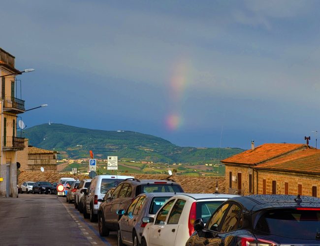 Vento, pioggia e utimido arcobaleno che ha illuminato Monte Conero, stagliandosi come una colonna di sette colori tra le nuvole sull’orizzonte di Osimo, a conclusione di un pomeriggio tempestoso nell’ultimo scorcio di estate. La foto è stata scattata da un nostro lettore con lo smartphone, in via Leopardi intorno alle 19.30 di oggi.