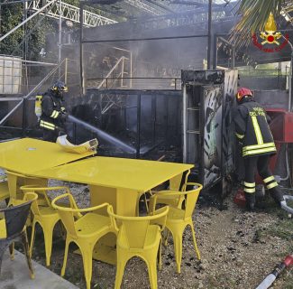 I pompieri sono stati impegnati nello spegnere le fiamme che si sono sviluppate in una parte del palco posizionato all’esterno del locale.