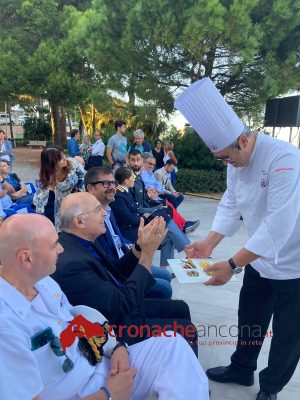 Monsignor Angelo Spina è invitato ad assaggiare una delle specialità cucinate dall’Unione Cuochi Marche durante il cooking show