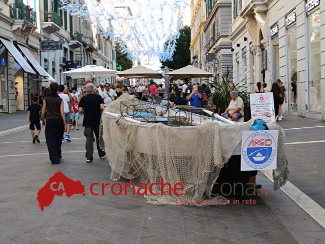 Da sottolineare poi come, in alto e poco distante da Tony Fratello, il Comune oltre ai nastrini di plastica bianco azzurri abbia posizionato delle reti da pesca tra i due quadrati che compongono piazza Roma, a sottolineare sempre di più lo stretto legame della città con il mare e chi vi lavora. E sempre per lo stesso motivo, all’altezza di Pandora e quindi nella parte bassa del corso vecchio, una barca con dentro secchi e attrezzi del mestiere ha attirato l’attenzione di tutti. Soprattutto dei bambini che a decine si sono chiesti cosa ci facesse un mezzo di mare in piena terra.
