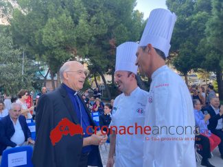 Monsignor Angelo Spina è invitato ad assaggiare una delle specialità cucinate dall’Unione Cuochi Marche durante il cooking show