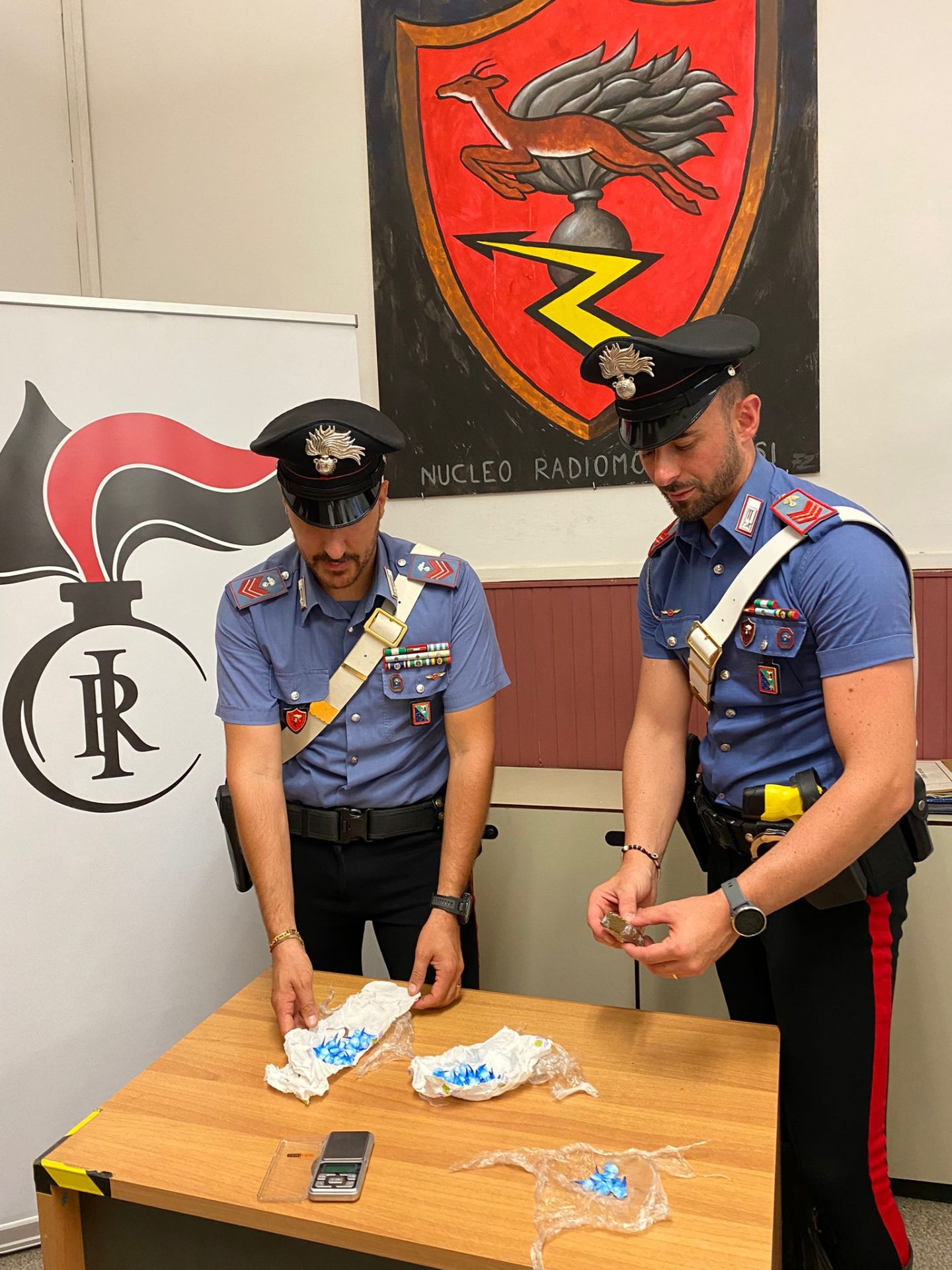 Perquisito, nel marsupio che teneva con sé i militari hanno trovato 37 grammi di cocaina, suddivisi in 43 dosi; un panetto di hashish del peso di 50,5 grammi e un bilancino elettronico di precisione.