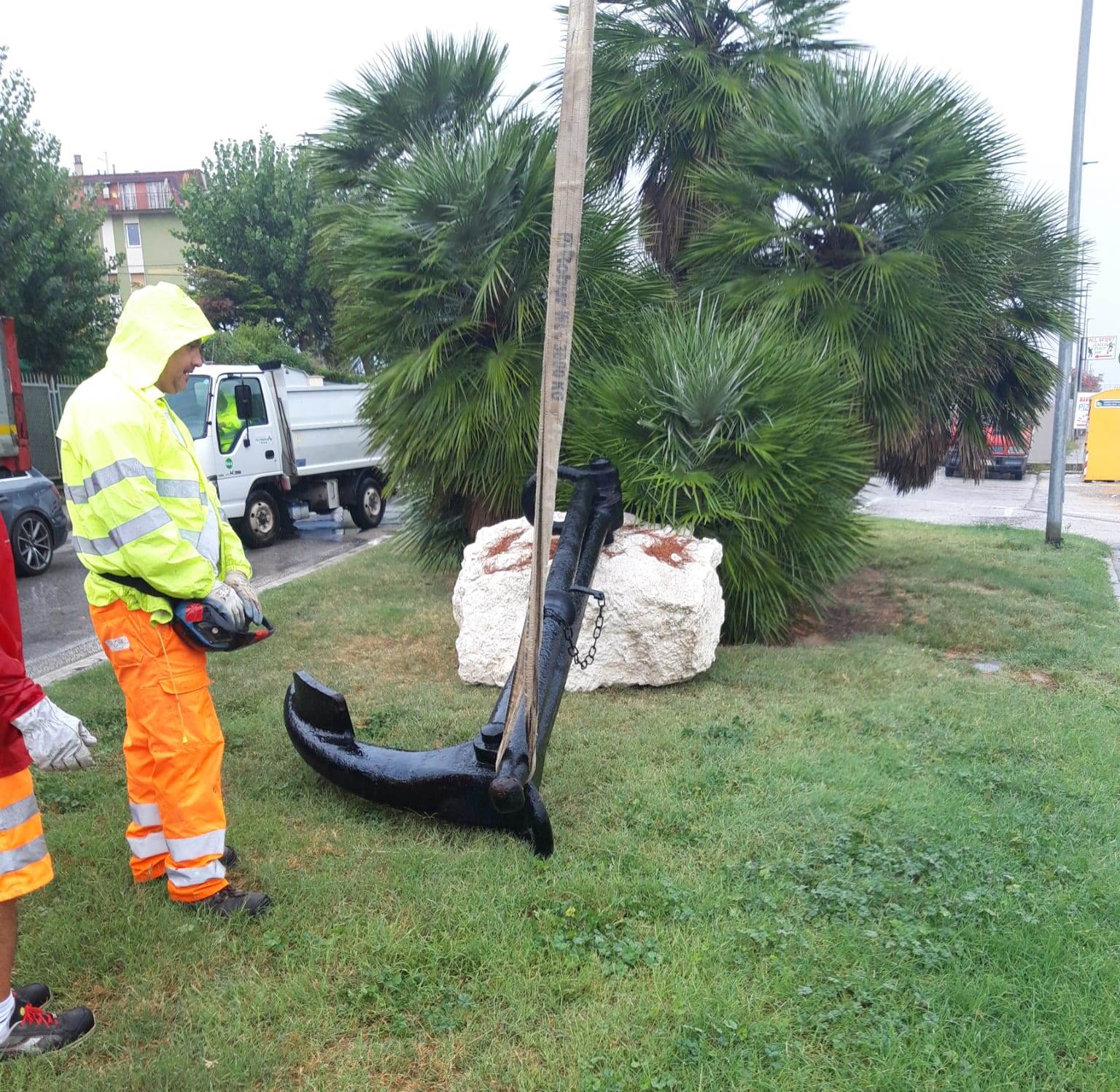 La tradizione marinara di Falconara è protagonista di una nuova installazione lungo via Flaminia, che dalla mattinata di ieri, 15 settembre, accoglie chi arriva in città viaggiando verso nord. All’incrocio con via Italia, nello spazio verde di fronte alla ex Caravella, è stata infatti posizionata una grande ancora appoggiata a uno scoglio, a ricordo di tutti i marittimi di Falconara scomparsi in mare nel corso degli anni. A seguire il progetto, l’assessore al Decoro Romolo Cipolletti, che ha individuato proprio all’ingresso sud della città, a due passi dalla spiaggia, il luogo migliore per il posizionamento.