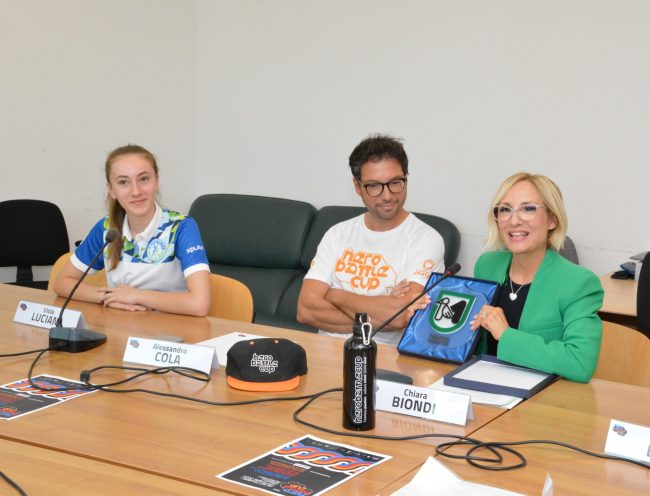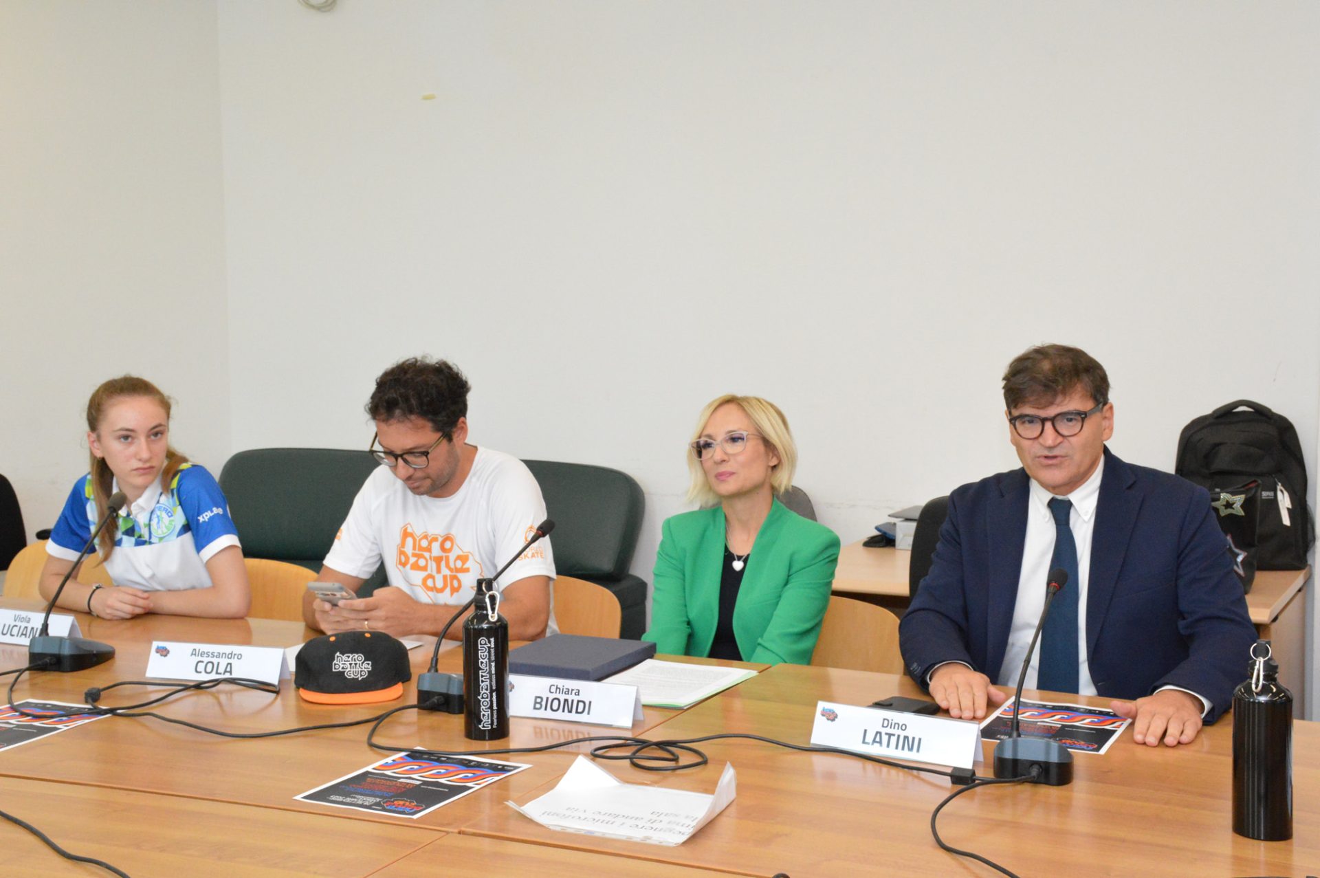 Per cinque giorni Osimo sarà la capitale dei pattini in linea. La città ospiterà la finale del circuito mondiale denominato Hero Battle Cup, dal 27 settembre al 1 ottobre al PalaBaldinelli. Una manifestazione che si presenta già con numeri da record: oltre 200 le iscrizioni arrivate da ben 14 nazionalità diverse. La presentazione dell’evento si è svolta ieri mattina in Regione, alla presenza dell’assessore regionale allo Sport, Chiara Biondi, del presidente del Consiglio regionale delle Marche, Dino Latini, del sindaco del Comune di Osimo, Simone Pugnaloni, del presidente Coni Marche, Fabio Luna, del presidente di Conero Roller, Alessandro Cola, di Valentina Jobbi, presidente Panathlon Club Osimo, e in collegamento del presidente della Federazione Internazionale Roller, Sabatino Aracu. Ospite d’eccezione Viola Luciani, la più giovane pattinatrice italiana di sempre a vincere un oro mondiale di freestyle. A lei l’assessore Biondi ha donato il crest della Regione Marche con il simbolo del Picchio, per il suo contributo a tenere alto il nome della regione.