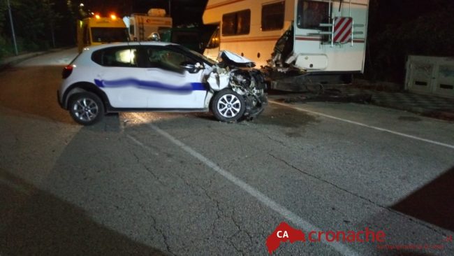 E’ successo intorno alle 2 quando l’auto di un servizio di vigilanza è finita contro due camper in sosta lungo la strada.
