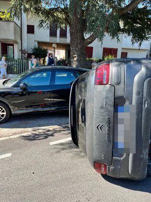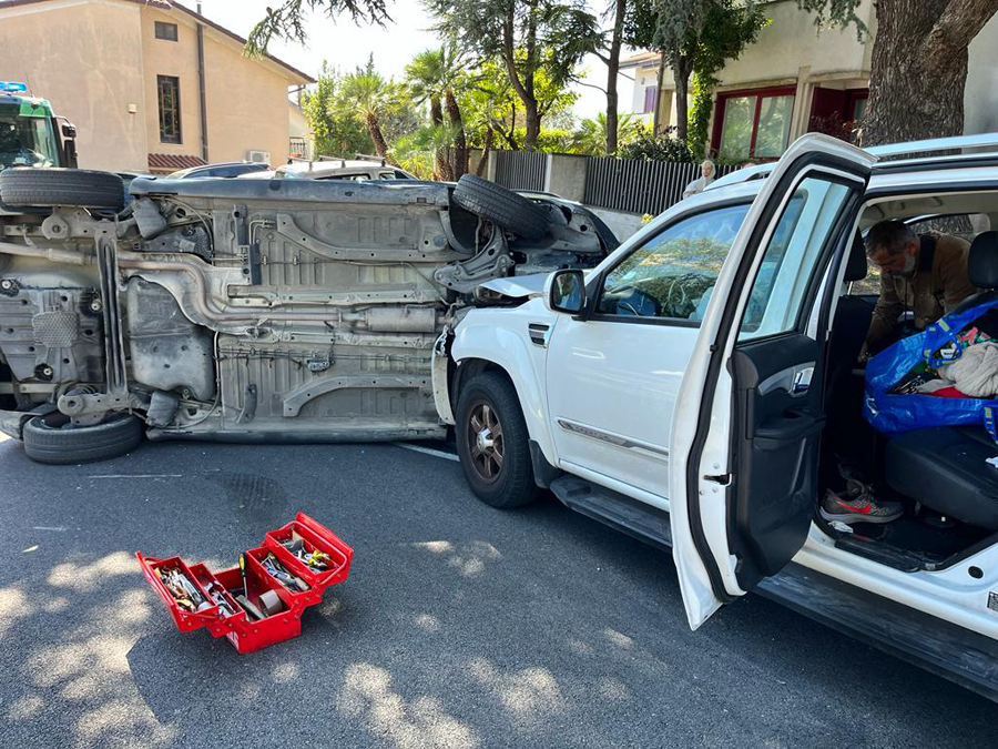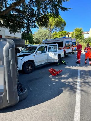 Frontale tra due auto in via della Madonnetta ad Ancona, con una terza vettura coinvolta nello scontro e ribaltata sull’asfalto, 4 i feriti soccorsi dalle ambulanze della Croce Rossa e della Croce Gialla.