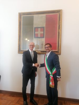 Visita stamane dell’ambasciatore del Belgio in Italia, Pier Emmanuel De Bauw, a palazzo del Popolo. Il diplomatico è stato accolto dal sindaco di Ancona, Daniele Silvetti. Un dialogo aperto e cordiale durante il quale il diplomatico, che successivamente ha incontrato il presidente della Camera di Commercio delle Marche, Gino Sabatini, ha rivolto alcune domande al Sindaco per meglio conoscere la fisionomia del capoluogo, lo stato di salute dell’economia e dell’occupazione, la condizione dei giovani e le prospettive. Il primo cittadino di Ancona ha tracciato il quadro di una città attenta alle relazioni internazionali e agli scambi con i Paesi, una città la cui economia gravita particolarmente attorno all’economia del mare e in particolare al porto, alla cantieristica con la sua manodopera specializzata e una costante domanda di commesse, ai servizi, alla logistica, alla pesca e alle piccole e medie imprese. Porto, interporto e aeroporto (collegato da anni con Bruxelles) sono i tre assi strategici imprescindibili.