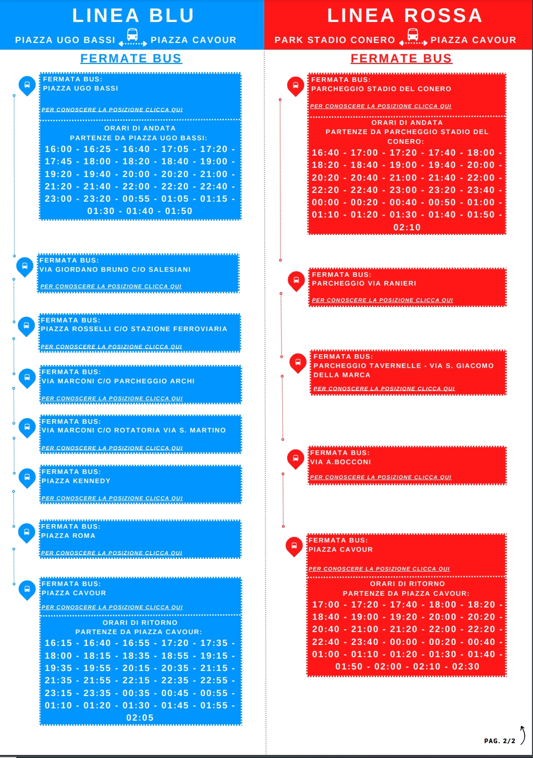 La linea blu invece partirà da piazza Ugo Bassi e anch’essa giungerà a piazza Cavour, con transito e fermate intermedie in via Giordano Bruno presso i Salesiani, in piazza Rosselli zona stazione ferroviaria, via Marconi – parcheggio degli Archi, via Marconi – rotatoria, piazza Kennedy e piazza Roma, e viceversa, a partire dalle 16,00 fino alle 2,05.