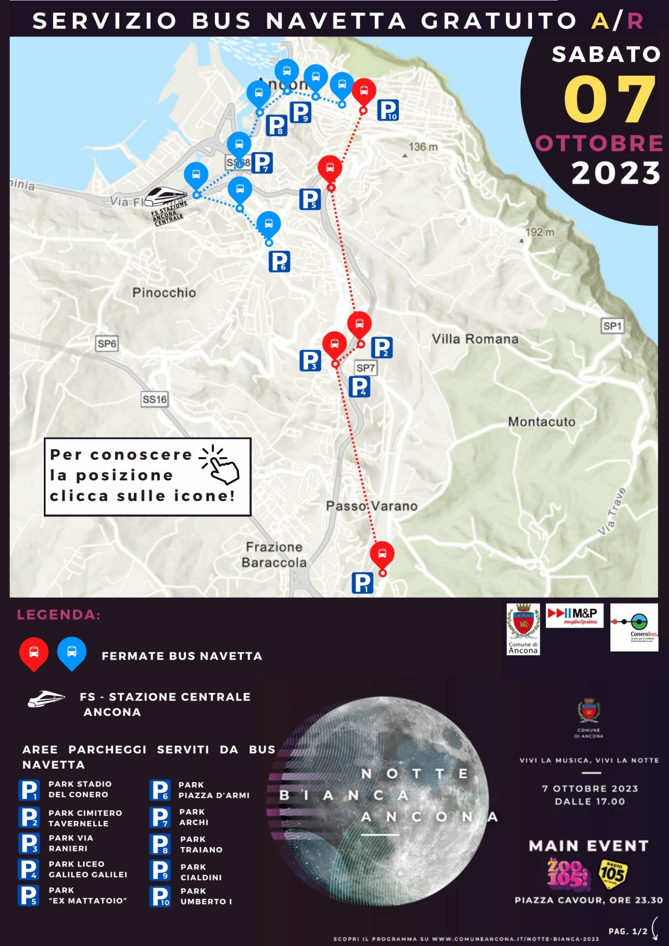 Tutte le informazioni aggiornate su navette e parcheggi, con grafiche interattive, saranno pubblicate nell’apposita sezione dedicata alla Notte Bianca 2023, raggiungibile dall’home page del sito istituzionale del Comune di Ancona www.comuneancona.it.