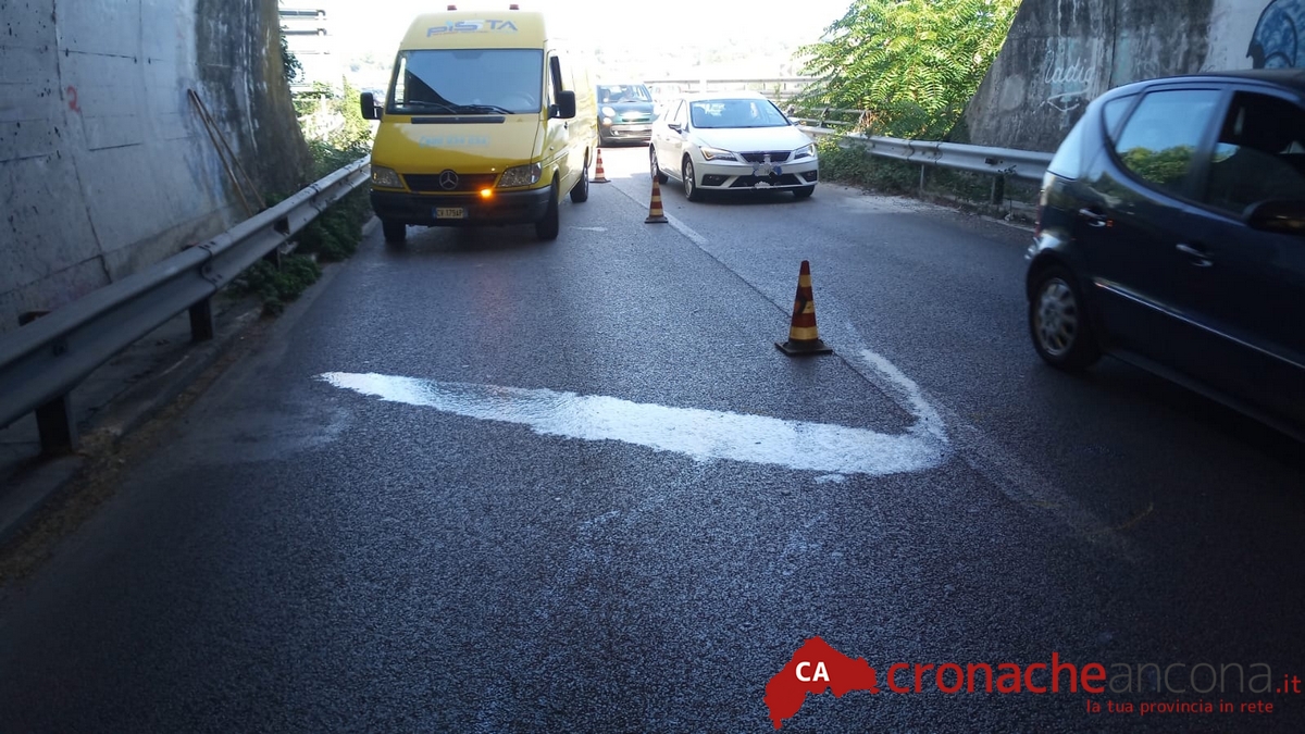 Il centauro, medicato e stabilizzato sul posto, è stato trasportato a Torrette con un codice rosso. Nessun altro veicolo è rimasto coinvolto ma la dinamica è tuttora in fase di accertamento.