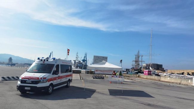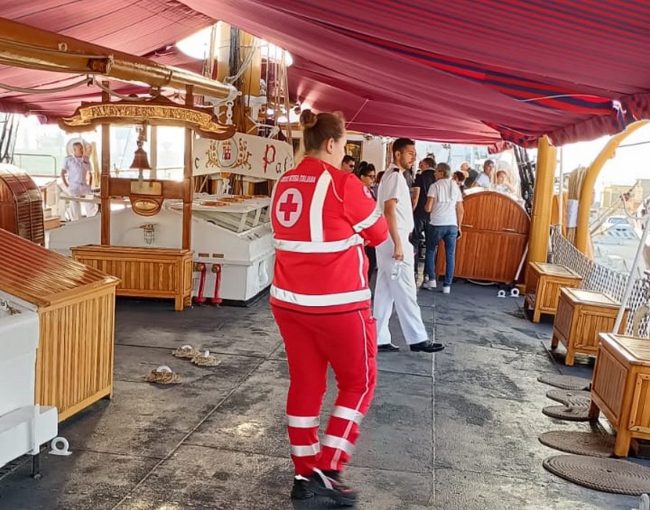 Nei pressi del veliero, oltre a un’ambulanza, la Croce Rossa ha predisposto anche un gazebo per offrire eventuale assistenza ai visitatori.