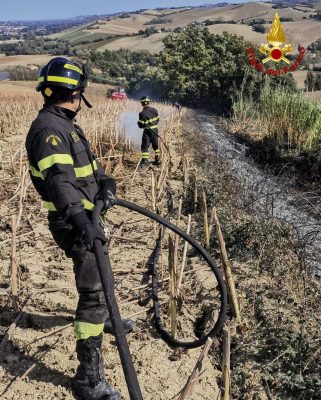 Mattinata di fuoco a Serra de’ Conti dove le fiamme, ai margini di via San Sebastiano, hanno divorato 500 mq. di residui derivanti dalla mietitura dei girasoli su un terreno di proprietà privata, avvolgendo di un fumo acre e denso tutta la zona. L’incendio è divampato intorno alle 11.30 , poi le lingue di fuoco si sono state alimentate. I vigili del fuoco sono intervenuti subito sul posto con i mezzi. La squadra di Arcevia intervenuta con un’autobotte ed un mezzo 4×4 ha provveduto a spegnere le fiamme, ed al momento sta bonificando l’area interessata. Non si segnalano persone coinvolte. La tesi più accreditata è quella dell’accidentalità. Per arginare e circoscrivere le fiamme che correvano sulle sterpaglie è stata comunque una corsa contro il tempo e sono stati necessarie quasi due ore di lavoro a ritmi serrati.