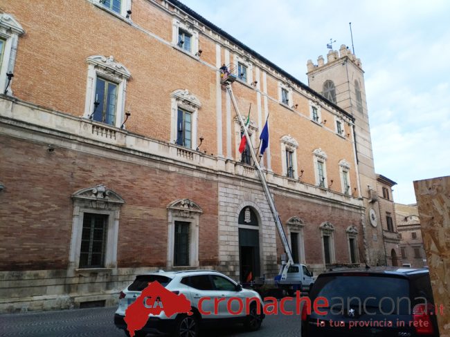 Operai della Dea Spa, oggi al lavoro all’impianto elettrico e di illuminazione sulla facciata di Palazzo comunale ad Osimo