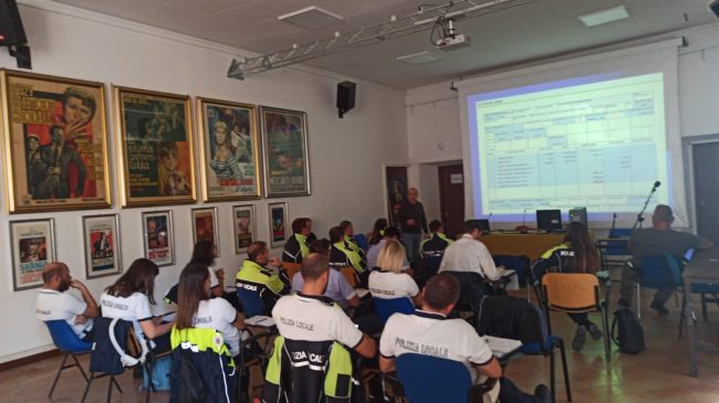 Una delle lezioni dei corsi teorici e pratici per il conseguimento delle patenti di servizio dei giovani agenti da poco in forza ai rispettivi Comandi delle Polizie locali delle Marche a Castelfidardo