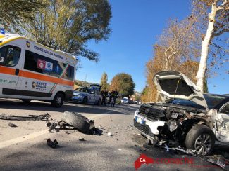 L’impatto tra i mezzi è stato violentissimo al punto che i pezzi sono volati lungo la carreggiata. Tra questi, anche una ruota.