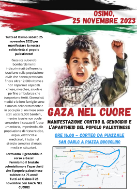 Sabato prossimo, 25 novembre, si svolgerà ad Osimo la manifestazione ‘Gaza nel cuore’ in solidarietà con il popolo palestinese, promossa sia da realtà associative della società civile osimana, sia da realtà associative e politiche a carattere regionale e nazionale, riunite in un comitato organizzatore. L’appuntamento è alle ore 16 al piazzale del San Carlo da cui partirà un corteo che si snoderà verso il centro storico passando per via Montefanese, via Colombo, via Cesare Battisti, Largo Trieste, via Matteotti e corso Mazzini fino a giungere in piazza del Comune dopo circa un’ora di tragitto.