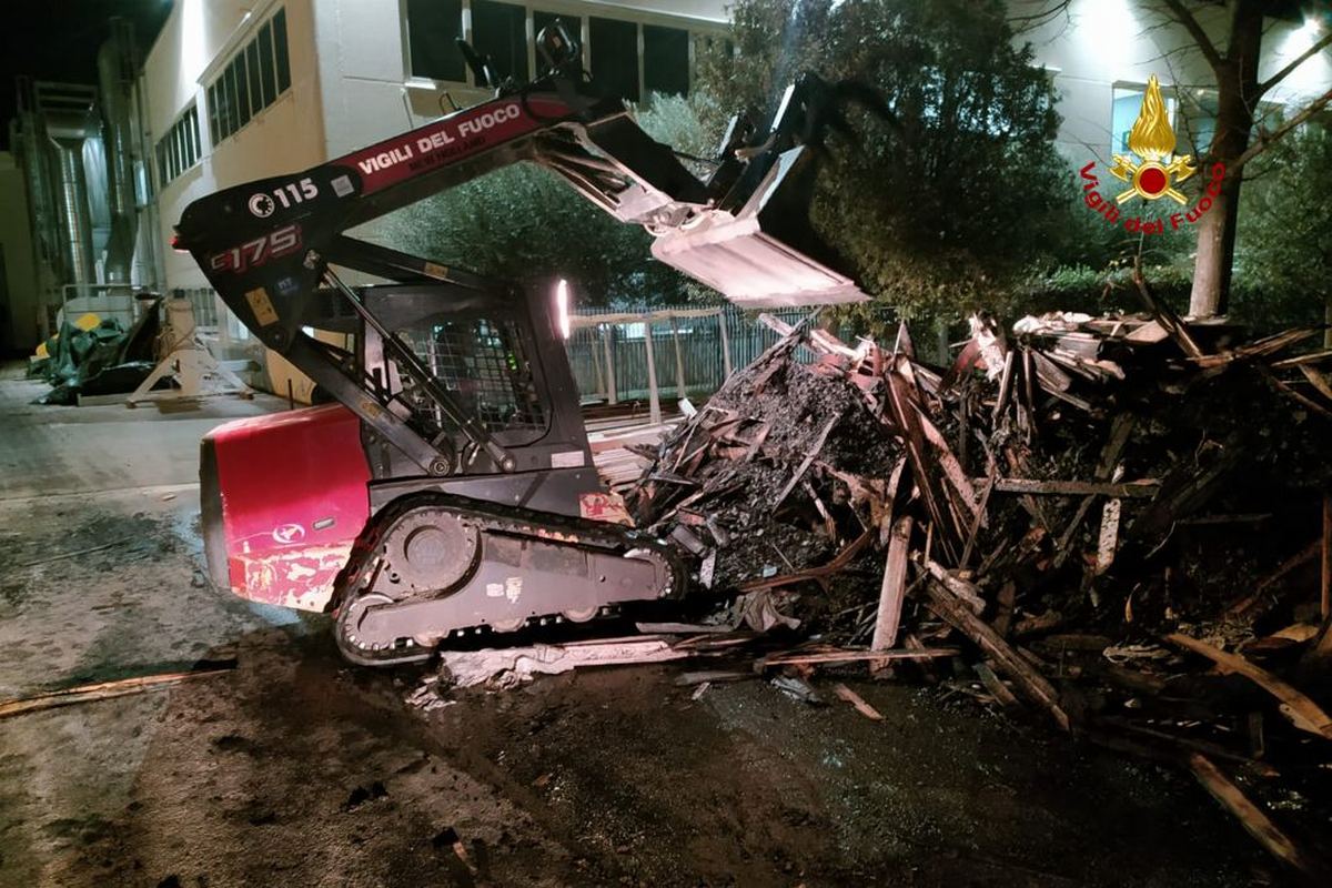Sono poi proseguite per tutta la giornata, anche con l’uso di mezzi per il movimento terra, le operazioni di smassamento all’interno del capannone industriale andato a fuoco nella notte.
