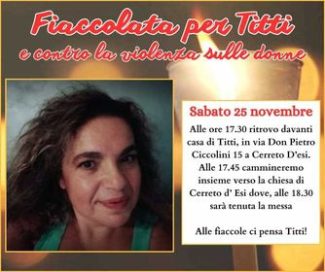L’entroterra montano è pronto a celebrare la Giornata internazionale contro la violenza sulle donne nel ricordo di Concetta Marruocco, l’infermiera 53enne uccisa dal marito lo scorso 14 ottobre. Tante le manifestazioni in programma a Fabriano, Genga, Sassoferrato, Serra San Quirico e soprattutto a Cerreto d’Esi dove ‘Titti’ abitava e dove è stata strappata all’affetto dei suoi cari. Una in particolare sta a cuore ai familiari della donna: la fiaccolata che partirà domani pomeriggio alle 17.45 da via Don Pietro Ciccolini. Il ritrovo è previsto alle 17.30 davanti alla abitazione di Concetta per snodarsi poi fino alla chiesa di Cerreto d’Esi dove alle 18.30 sarà officiata la funzione religiosa.