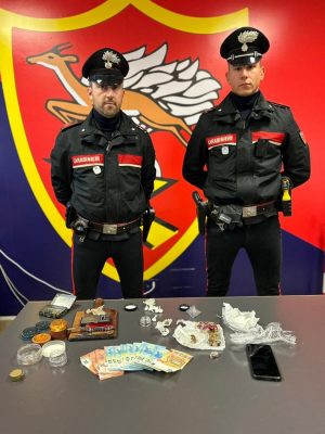 Fermato e identificato, si è proceduto a una perquisizione domiciliare a seguito della quale è stato trovato un quantitativo di sostanza stupefacente di vario tipo pari a 130 grammi circa, suddivisi in 79 grammi di diversi pezzi di hashish, 50 grammi circa di cocaina in parte già confezionata in 8 dosi termosaldate e circa 0.30 grammi di marijuana, oltre a circa 300 euro in contanti, divisi in banconote di piccolo taglio, bilancino e coltelli intrisi di sostanza stupefacente.