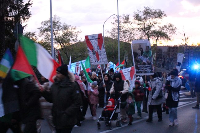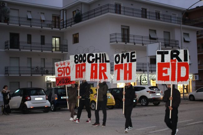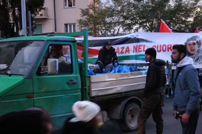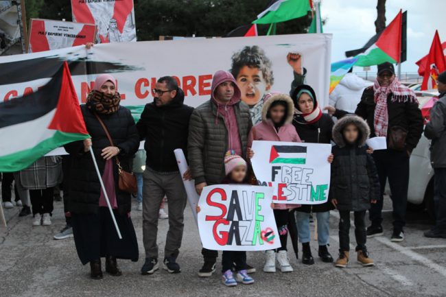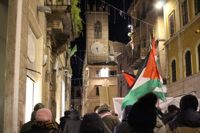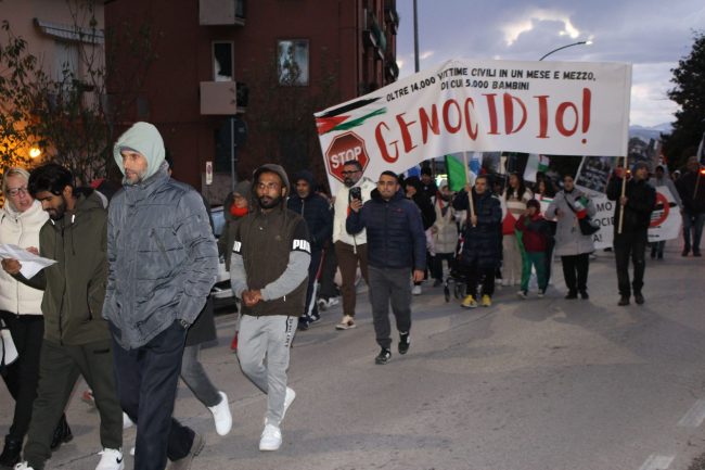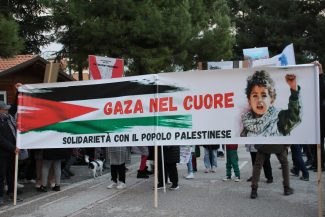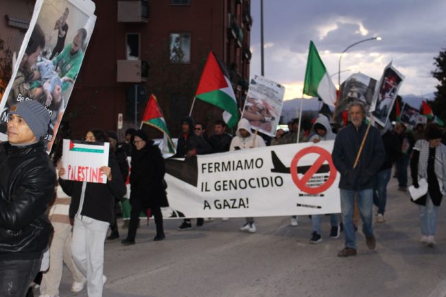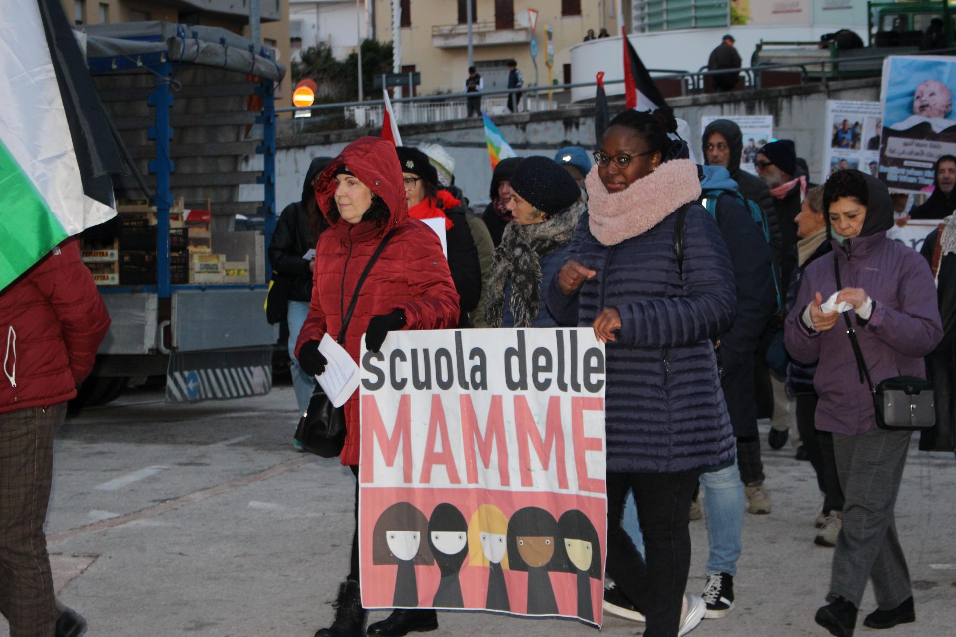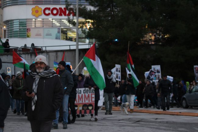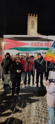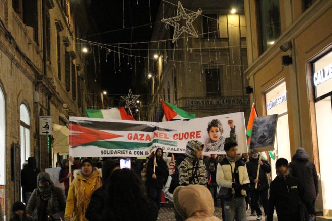 Già dal primo pomeriggio invece un vento forte ha spazzato via progressivamente le nuvole, permettendo ai manifestanti, circa 500 secondo gli organizzatori, di partire alle ore 16.30 al piazzale del San Carlo alla volta del centro storico, pur con una temperatura gelida. «Il corteo era diviso in varie sezioni tematiche e si riprometteva attraverso striscioni, slogan e cartelli di portare non solo la propria solidarietà al popolo palestinese, – ricorda il comunicato del Comitato promotore manifestazione – ma anche di informare sulla terribile ecatombe in corso a Gaza, dove la popolazione civile sta subendo bombardamenti indiscriminati da parte dell’esercito israeliano su case, scuole, chiese, moschee, addirittura ospedali e ambulanze che trasportano feriti. Ricordiamo che si tratta di crimini di guerra. Quasi 15.000 vittime civili, di cui 6.000 bambini nell’arco di un mese e mezzo sono la macabra contabilità di un vero e proprio genocidio. Nella giornata internazionale contro la violenza sulle donne che ricade proprio il 25 novembre, è stato ricordato dall’associazione Scuola delle Mamme di Osimo che nessun mezzo di informazione, né tanto meno nessuna istituzione italiana, ha speso una parola per le 4.000 donne uccise dai bombardamenti a Gaza».