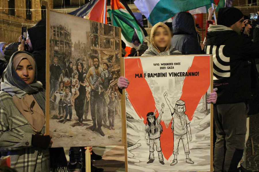 La sezione di apertura del corteo era dedicata ai bambini «che sono il nostro futuro e la nostra speranza: lo striscione di testa rappresentava il bambino con il pugno alzato simbolo della manifestazione e la scritta Gaza nel cuore.- prosegue il comunicato – A seguire i cartelli dove un bambino palestinese ed un bambino indiano americano alzano il pugno al cielo in segno di vittoria. La seconda sezione denunciava il genocidio in corso con due striscioni: uno recitava un inequivocabile Stop genocidio! mentre l’altro sottolineava l’ipocrisia dell’ “esportazione della democrazia” a suon di bombe».