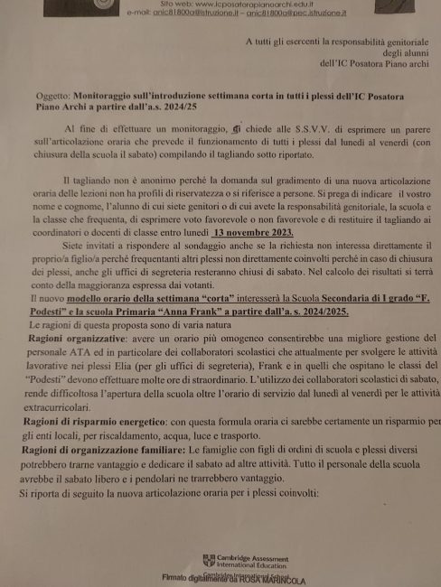 Andiamo adesso con ordine e proviamo a fare un po’ di chiarezza in una situazione quantomai ingarbugliata. Nel corso degli ultimi giorni siamo stati contattati da diversi genitori i cui bambini frequentano la scuola primaria Anna Frank, facente parte dell’istituto comprensivo Posatora-Piano-Archi. Il problema? Un giorno, tornando a casa, i loro ragazzini avevano in mano una lettera firmata dalla dirigente scolastica, Rosa Marincola, in cui si chiedeva di esprimere un parere, per la precisione uno per genitore o comunque per responsabile dell’alunno, in merito alla chiusura della loro scuola il sabato con relativo allungamento dell’orario scolastico dal lunedì al venerdì, entro e non oltre il 13 novembre 2023. Un provvedimento che andrebbe a riguardare direttamente anche le Podesti.