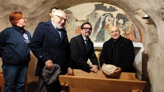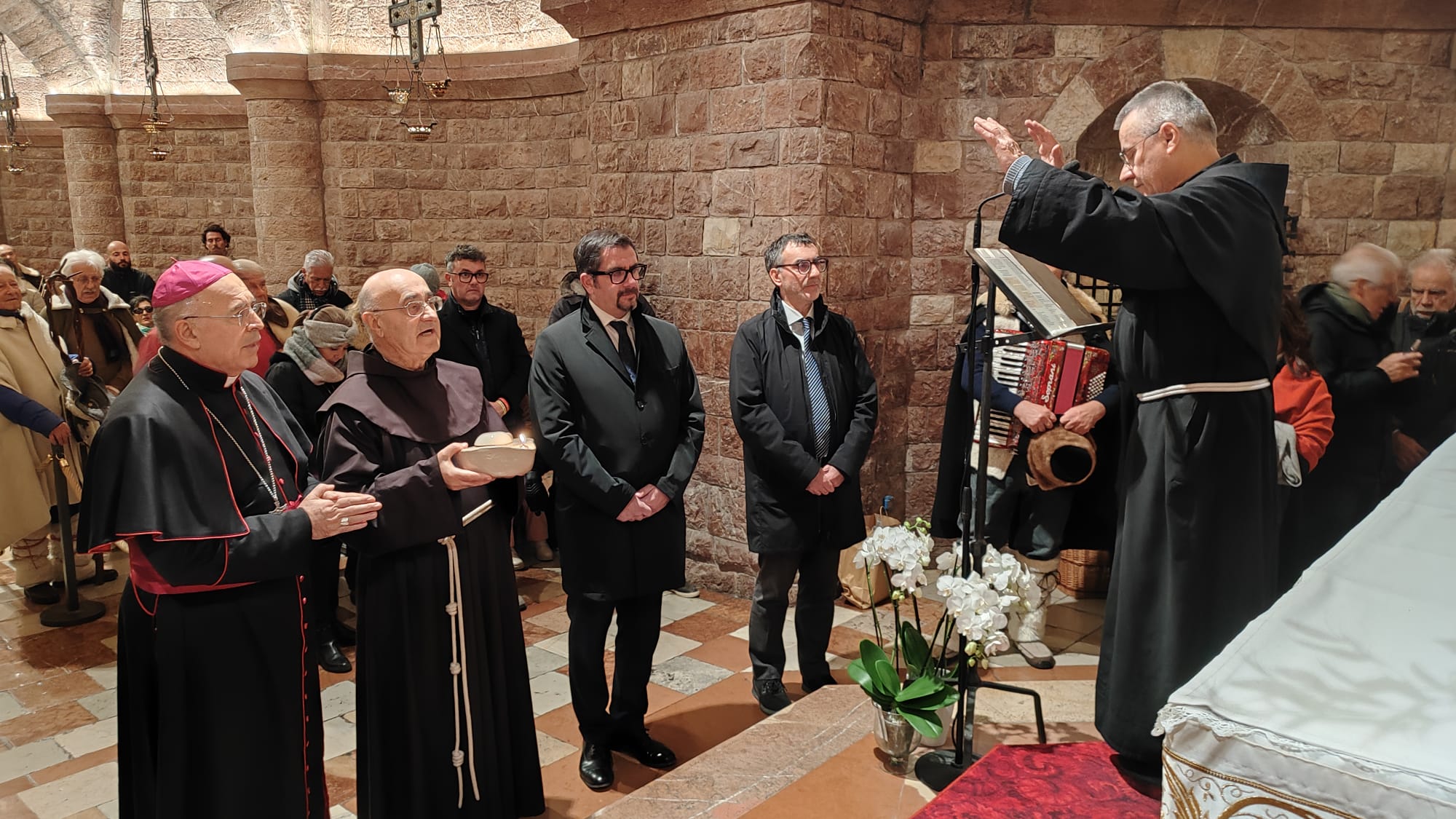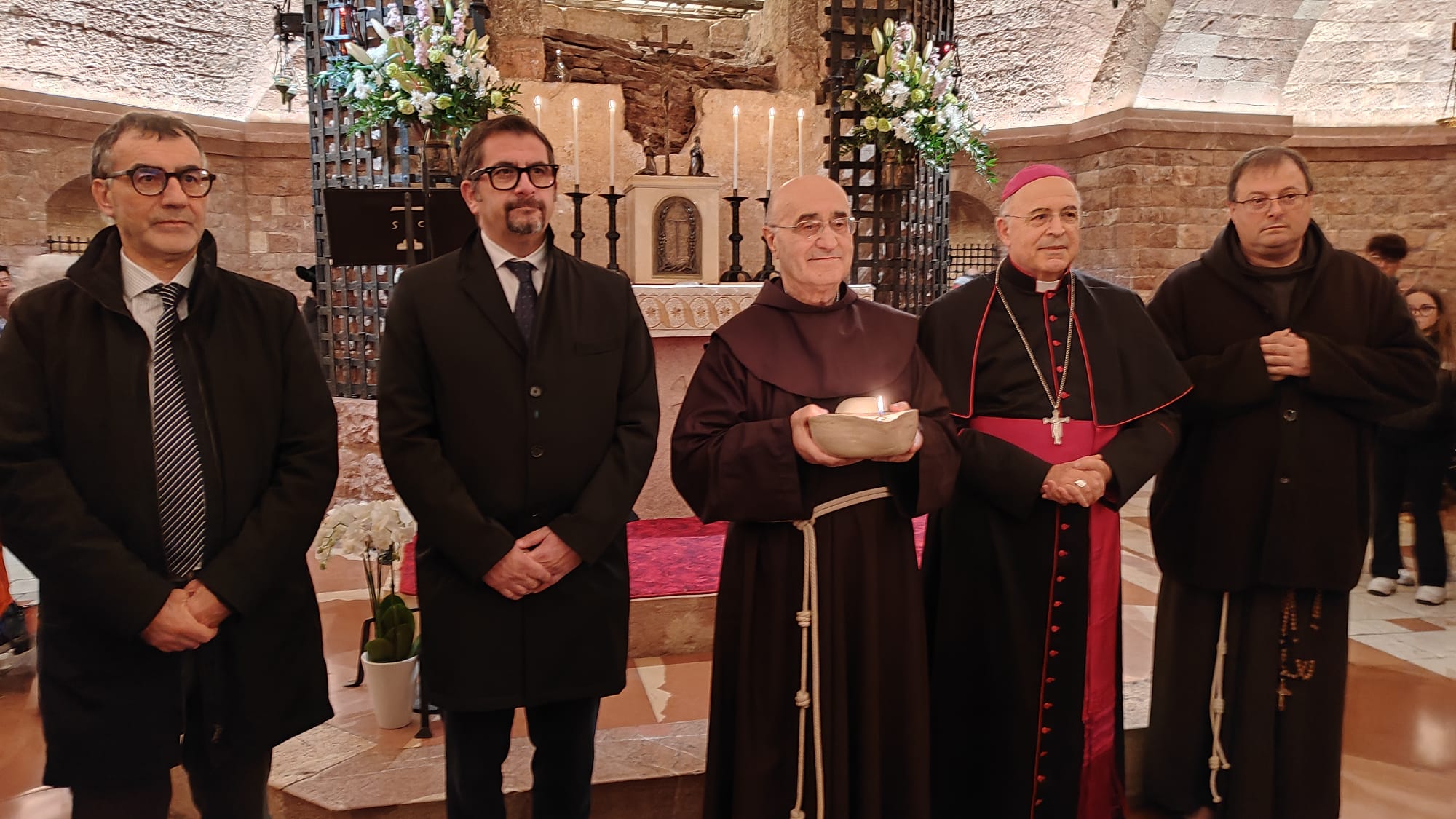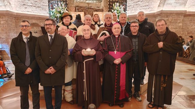 Successivamente il gruppo, nel quale erano presenti anche Massimiliano Polacco in rappresentanza della Camera di Commercio di Ancona e Marcello Bedeschi in rappresentanza dell’Anci, padre Simone Giampieri, provinciale dei Frati Minori e padre Alvaro Rosatelli, presidente delle Opere Caritative e del Comitato, si è recato ad Assisi: nella tappa forse più significativa della giornata è stato accolto dai frati della Basilica di San Francesco e dalla sindaca di Assisi Stefania Proietti, si è recato presso la tomba del Santo e, dopo un breve momento di raccoglimento, ha acceso una lampada, simbolo di pace. «Quella di oggi è una giornata splendida. – ha commentato mons. Spina – Andando a Greccio dove è stato realizzato il primo presepe e qui ad Assisi per accendere la luce dalla lampada sulla tomba di Francesco uomo di pace, abbiamo compiuto un percorso in cui la culla dove il bambino è stato accolto ci ricorda che deve essere il nostro cuore ad accogliere Gesù Cristo che è la vera luce del mondo, il portatore della pace. Francesco questo l’aveva capito ed ecco perché pregò dicendo signore fa di me uno strumento della tua pace».