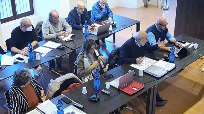 I banchi di minoranza del Consiglio comunale di Fabriano: Roberto Sorci è il secondo da destra seduto in prima fila, Danilo Silvi il primo da sinistra in seconda fila