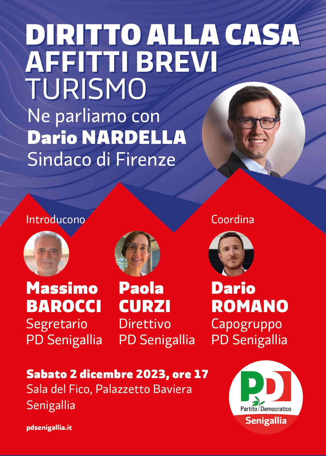 Sabato 2 dicembre, alle 17, presso la Sala del Fico di Palazzetto Baviera, il Pd Senigallia organizza un incontro/dibattito sul tema del diritto alla casa, affitti brevi e turismo. L’ospite d’eccezione, per questa iniziativa, sarà Dario Nardella, sindaco di Firenze, il quale ha affrontato e sta affrontando il difficile tema legato all’equilibrio tra residenzialità e affitti brevi in una città importante come Firenze, ai vertici delle classifiche mondiali per ricettività e turismo. Introdurranno la serata il segretario del Pd, Massimo Barocci, e il membro del direttivo Paola Curzi. Coordinerà la serata il capogruppo del Pd Dario Romano. L’entrata è libera fino a esaurimento posti