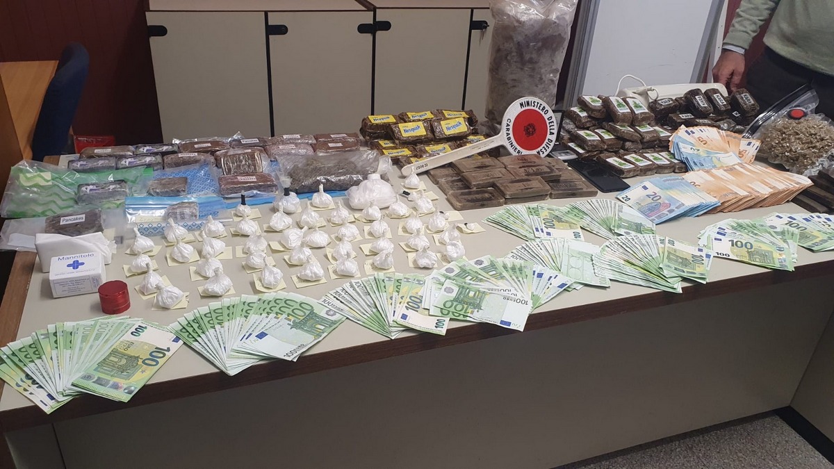 All’interno dell’abitazione, in uso ad un 49enne e a una 36enne, sono stati così rinvenuti complessivi 533 grammi di cocaina; 1,669 chili di hashish; 66,82 grammi di marijuana oltre a sostanze da taglio e per il confezionamento delle singole dosi e alla somma contante di 64.600 euro, ritenuta verosimile provento dell’attività di spaccio.