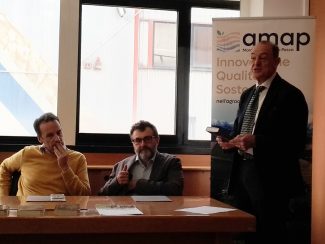 Da sin. Renato Frontini e Alberto Maria Alessandrini Passarini, questa mattina nella sede Amap di via Edison a Osimo