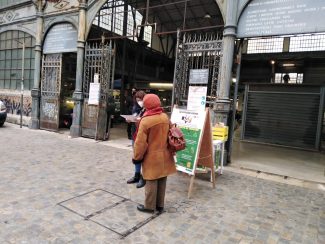 L’ingresso del Mercato delle Erbe e alcuni suoi frequentatori ai tempi del Covid, quando svolse una funzione ancor più essenziale del solito per i residenti della zona