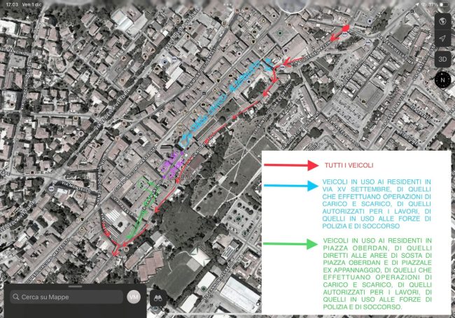 In piazzale ex Appannaggio all’intersezione con via San Martino – Piazza Oberdan è istituito l’obbligo di svolta a destra per tutti i veicoli in direzione via XX Settembre. In via XX Settembre nel tratto compreso tra via Pastrengo e Piazza Oberdan la circolazione veicolare sarà regolamentata a senso unico alternato. In via Pastrengo all’intersezione con via XX Settembre è istituito l’obbligo di svolta a destra per tutti i veicoli a eccezione di quelli in uso ai residenti in Piazza Oberdan, di quelli diretti alle aree di sosta di Piazza Oberdan e di piazzale ex Appannaggio, di quelli che effettuano operazioni di carico e scarico.