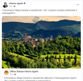 «C’è una contraddizione profonda tra le battaglie che hanno portato Sassoferrato a essere inserita tra i borghi più belli d’Italia, grazia anche alla bellezza del suo paesaggio, e la paventata costruzione di due mega impianti fotovoltaici a ridosso del Monte Strega e in prossimità di siti culturali di straordinario valore. Da sottosegretario dico no a quello che sarebbe uno scempio al paesaggio e all’ambiente. Su questi temi non sono tollerate ambiguità» spiega in una nota ufficiale Vittorio Sgarbi riferendosi esplicitamente alla presentazione al comune di Sassoferrato, da parte di una società, dei due mega impianti fotovoltaici in contrada Monterosso Stazione.