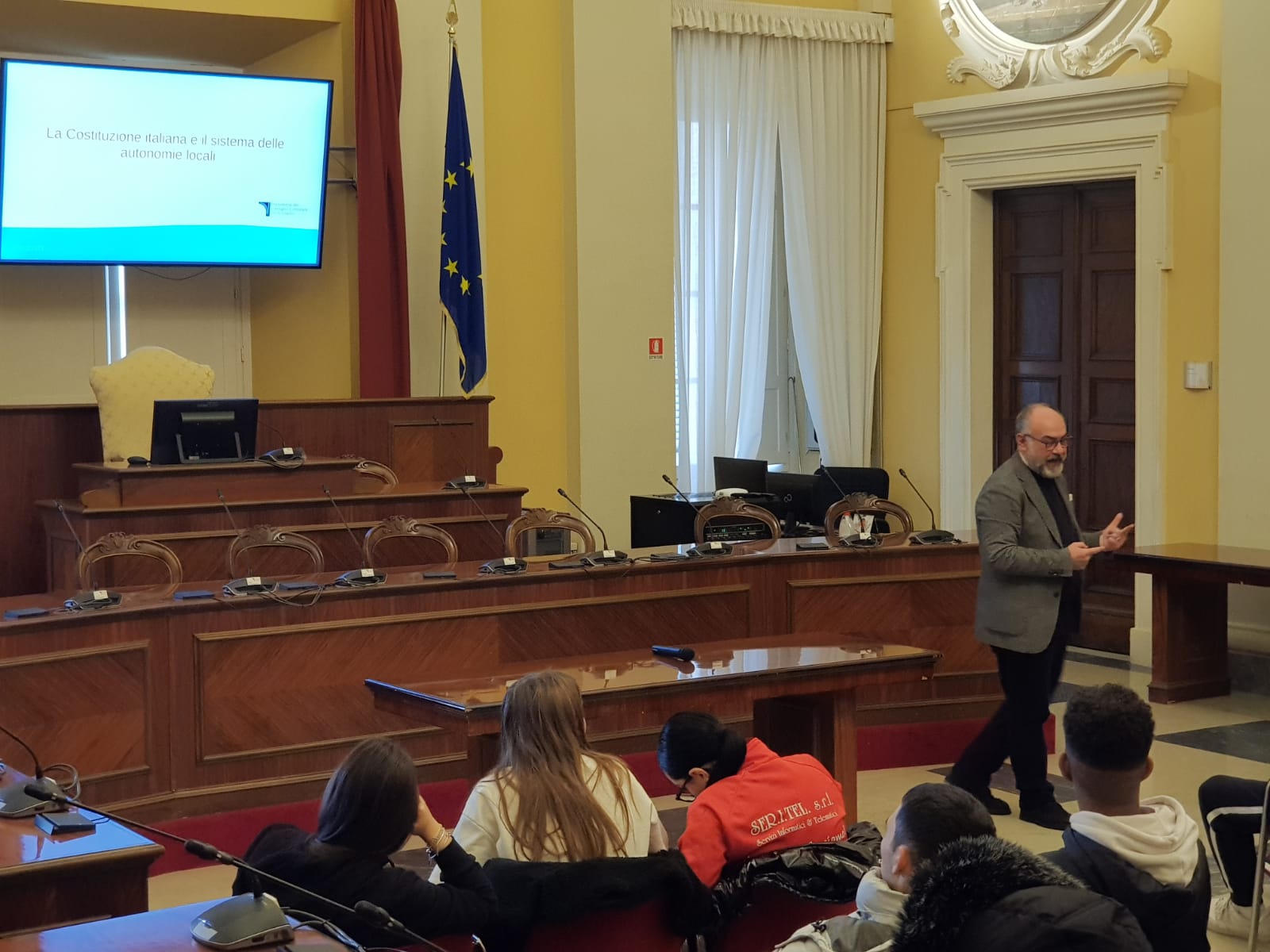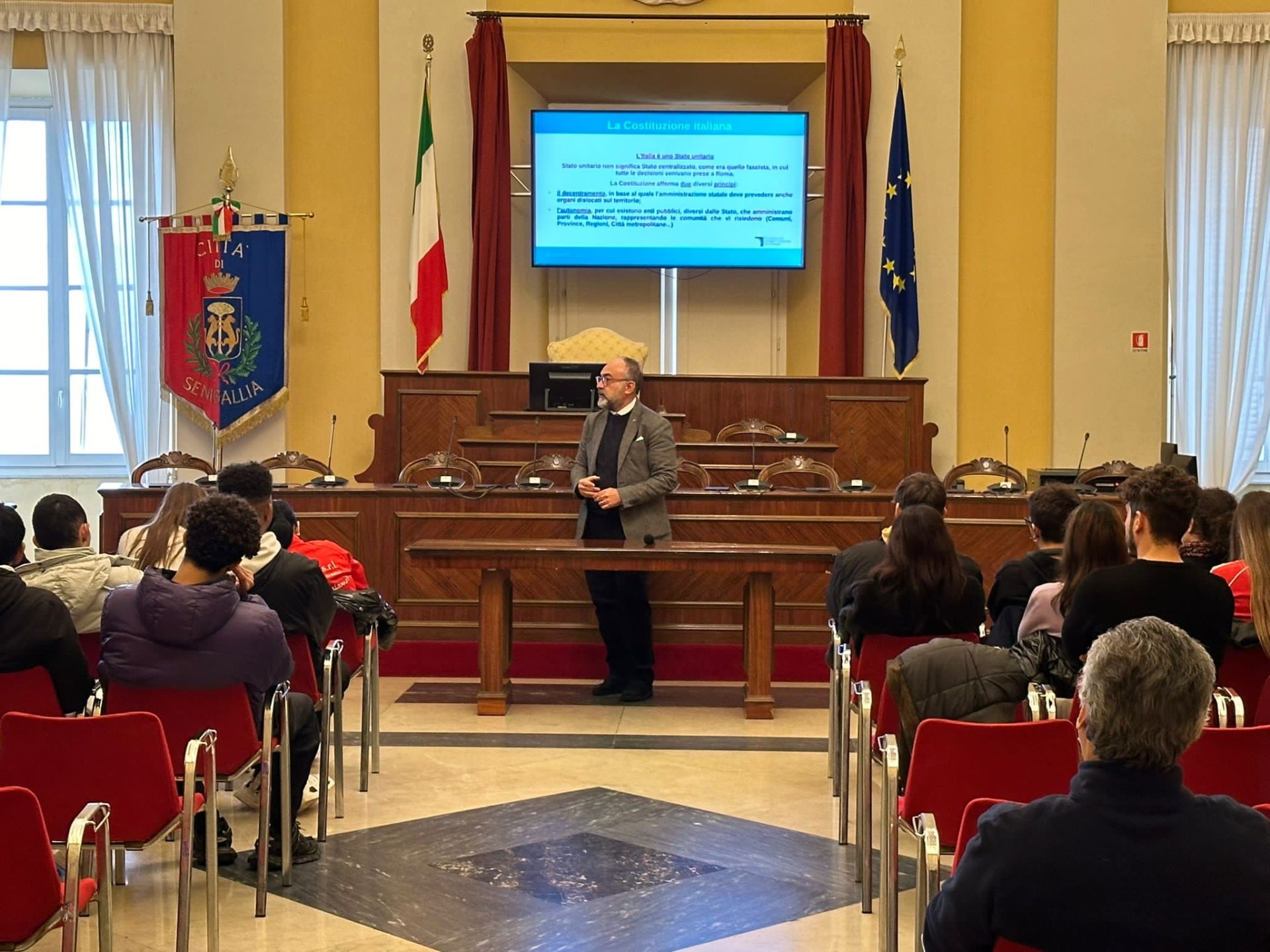 Questa mattina, nell’aula consiliare “Giuseppe Orciari” del Palazzo comunale, il presidente del Consiglio di Senigallia, Massimo Bello, ha incontrato gli studenti della 4B/Eno dell’Istituto Panzini, per una lezione sul sistema delle autonomie locali e sulla Costituzione. L’incontro, voluto dal prof. Michelangelo Soccio, ha offerto l’opportunità agli studenti senigalliesi di conoscere e di approfondire alcuni aspetti e nozioni, che riguardano, soprattutto, il funzionamento e l’organizzazione del Consiglio, della Giunta e del sindaco, nell’ambito dei principi di decentramento e di autonomia, sanciti dalla Costituzione, ripercorrendone anche l’evoluzione storica, legislativa ed istituzionale.