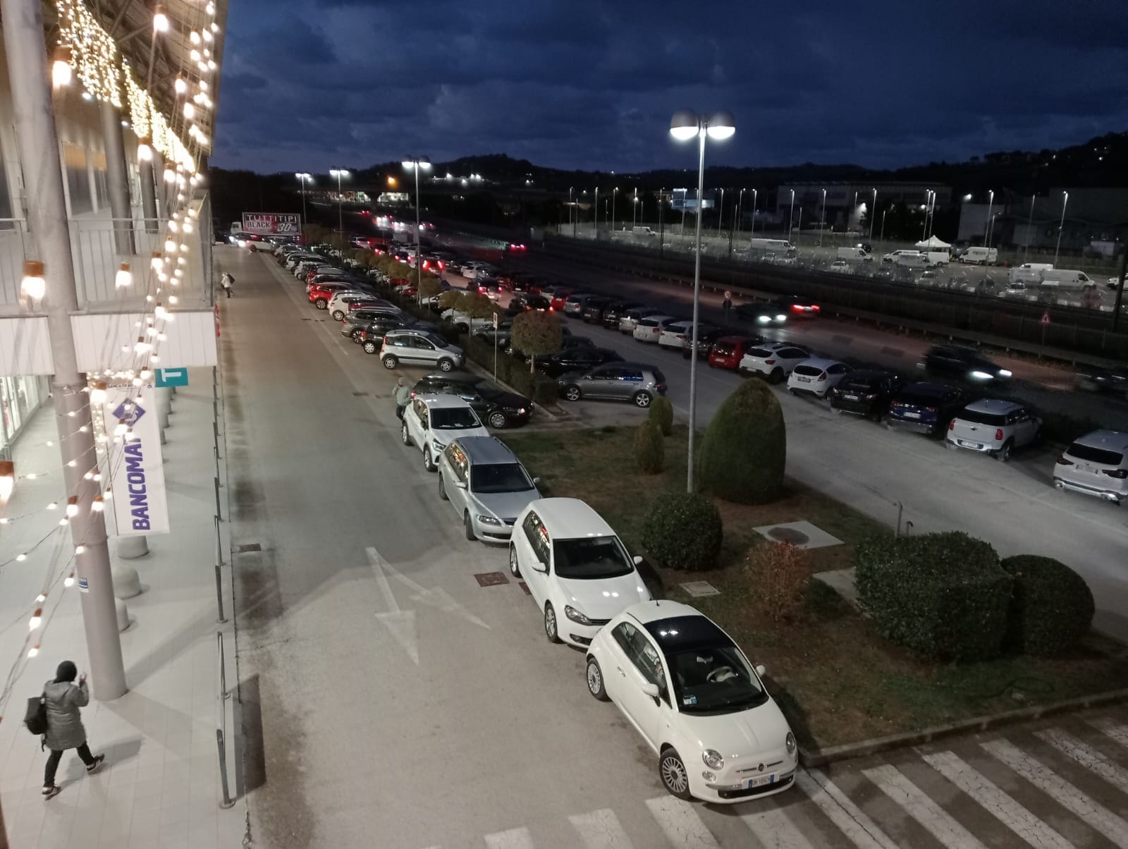 La foto del parcheggio del parco commerciale Cargopier postata dal sindaco Simone Pugnloni per dimostrare l’afflusso di clienti nonostante i lavori stradali che ne rendono difficoltoso l’accesso