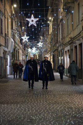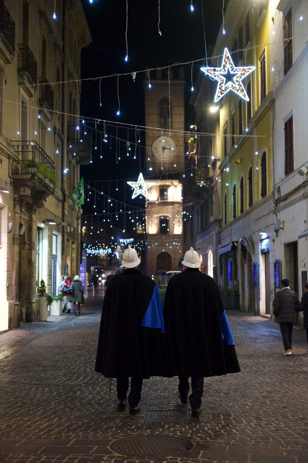 Ad allietare le vie del centro storico di Osimo, i giorni scorsi con il comandante del Corpo, Daniele Buscarini, è stato svolto un servizio da due operatori di Polizia locale in alta uniforme che, a piedi, hanno pattugliato il centro cittadino creando così un’atmosfera suggestiva e coinvolgente con i presenti che hanno potuto ammirare l’alta uniforme con sciabola e mantello della Polizia locale. Famiglie, bambini e anziani, oltre ad ammirare le luci natalizie, si sono avvicinati con entusiasmo agli agenti in alta uniforme per scattare foto e chiedere informazioni. «Un momento molto entusiasmante per rafforzare ancora di più il legame tra cittadini e Polizia Locale e scambiarsi reciprocamente gli auguri» conclude Gatto.