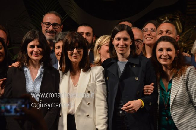 Il 10 maggio Elly Schlein, segretaria del Partito Democratico, tiene al Teatro delle Muse un lungo discorso in favore della candidatura di Ida Simonella. Con lei sul palco anche l’analoga regionale Chantal Bomprezzi.
