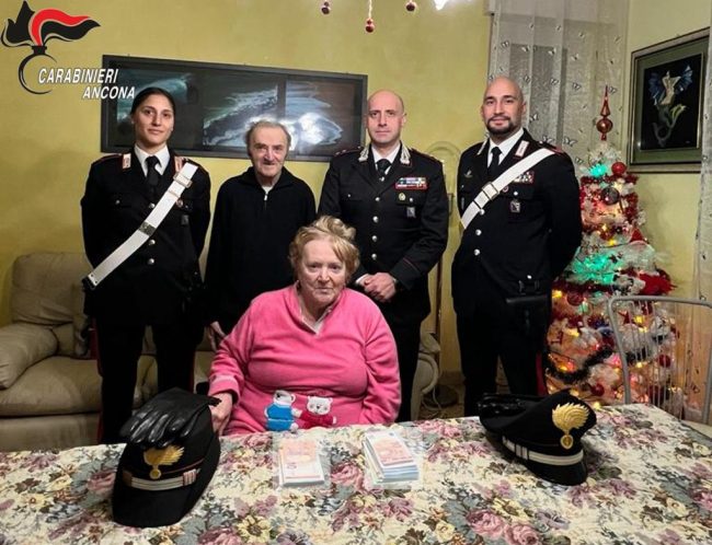 Nella foto: l’uomo di 79 anni e la moglie di 73, ricevono dal comandante e dai militari della Tenenza carabinieri di Falconara la restituzione del denaro in contanti che gli era stato rubato dalla borseggiatrice