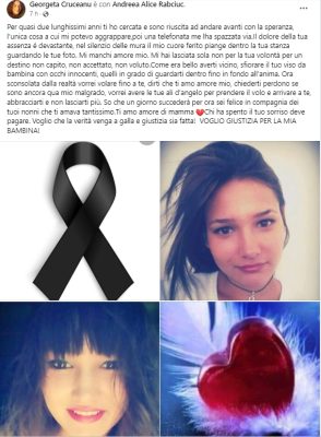 Georgeta Cruceanu, la mamma di Andreea Rabciuc, affida ad un post su Facebook le parole dedicate alla figlia.