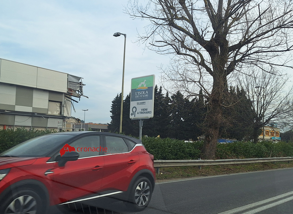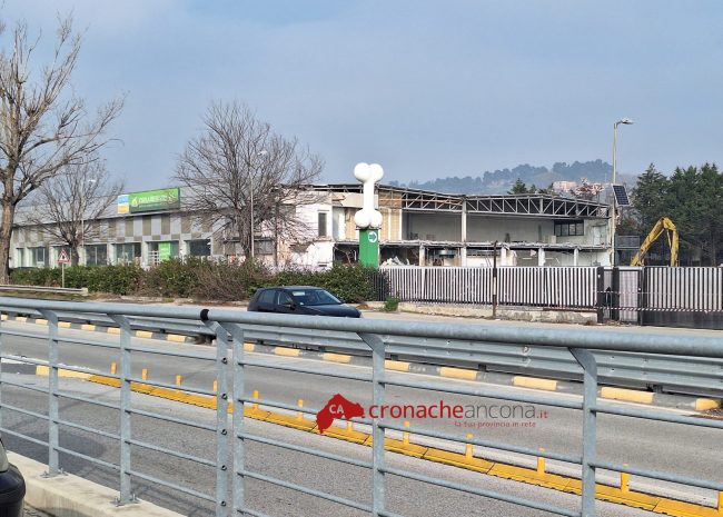 Lavori di demolizioni in corso alla Baraccola di Ancona per il capannone di via Pontelungo che un tempo accoglieva l’ex sala Bingo (chiusa dal 2009) e danneggiato da un incendio nel 2011.