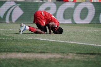 L’esultanza di Saco, Ancona batte Olbia 2-0