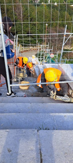 Per quanto riguarda la scelta dei materiali lapidei e dei leganti utilizzati per la costruzione della scalinata invece, alcuni dei quali presentavano fenomeni di erosione e di degrado evidente, è stato condotto, insieme con la soprintendenza, uno studio per conoscere le caratteristiche fisico-chimiche dei materiali presenti e per individuare, di conseguenza, i materiali da utilizzare per eventuali integrazioni. Dalle analisi è emerso che i campioni analizzati sono identificabili come rocce carbonatiche.