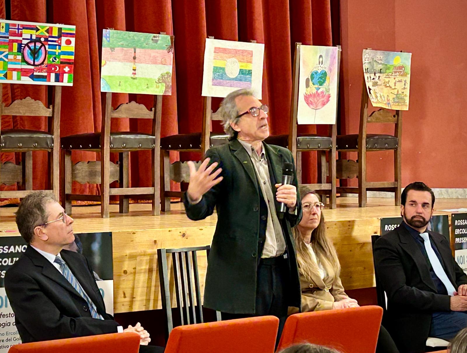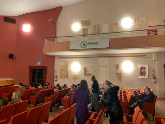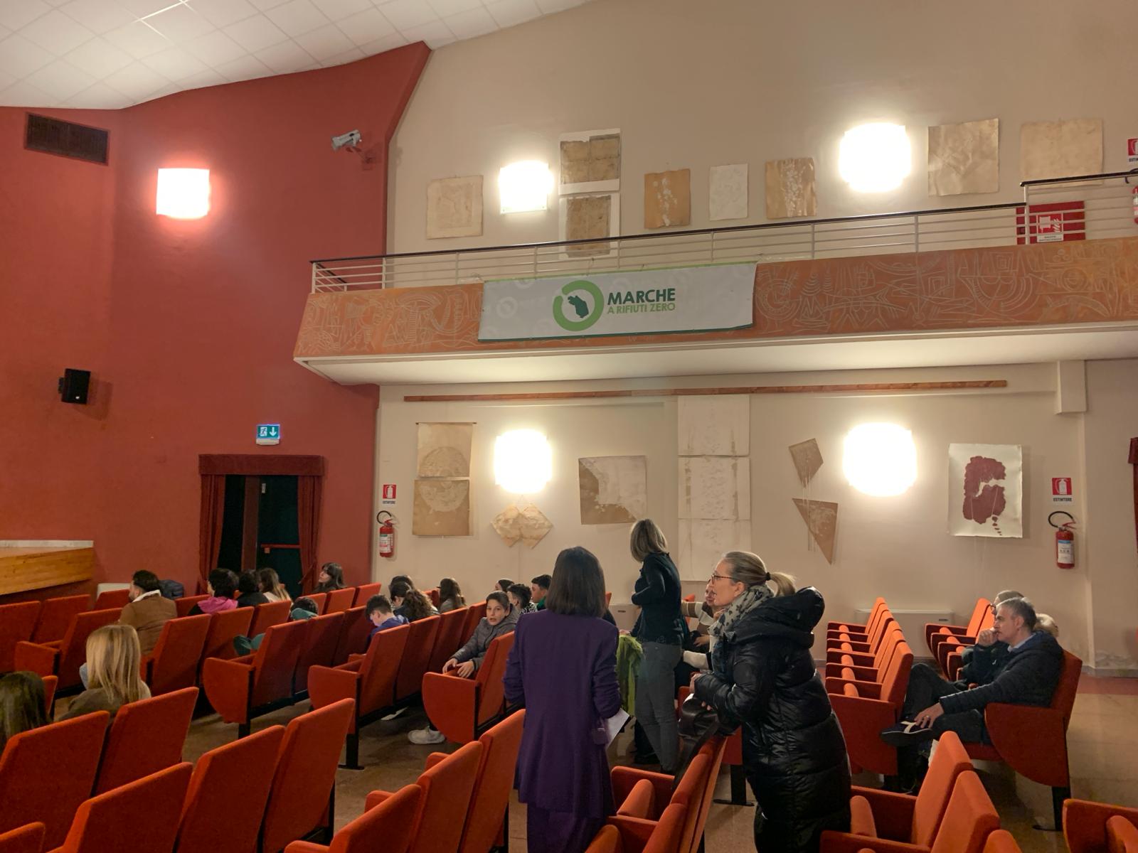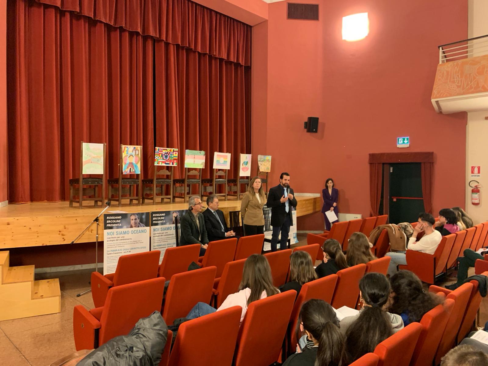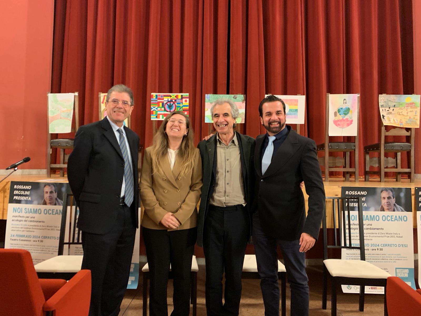 Si è svolta oggi a Cerreto d’Esi, presso il Teatro Casanova, la presentazione del libro ‘Noi Siamo Oceano’ di Rossano Ercolini, il manifesto per una ecologia del cambiamento, organizzata dall’amministrazione comunale con la collaborazione dell’associazione Marche a rifiuti zero Ets. Nell’ambito dell’evento è intervenuto Claudio Tedeschi, amministratore delegato della società Dismeco s.r.l. di Marzabotto, che ha presentato il progetto per il recupero degli elettrodomestici provenienti dalla raccolta differenziata da utilizzare finalità di aiuto sociale. In platea, gli studenti della scuola media ‘Stanislao Melchiorri’, cittadini, rappresentanti di associazioni e di enti pubblici e privati. In apertura, il vice presidente del Lions Club di Fabriano,  Andrea Rivosecchi, ha consegnato gli attestati di partecipazione agli alunni che si sono iscritti al concorso “Un poster per la pace”. Ha moderato l’incontro Beatrice Mezzanotte, docente dell’Istituto comprensivo Moro – Carloni. Massimo Melchiorri, docente e artista, insieme agli alunni ha dipinto le pareti.