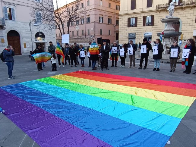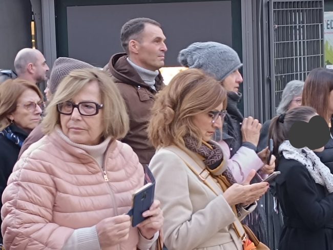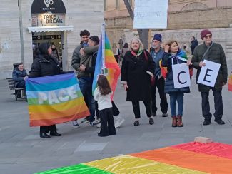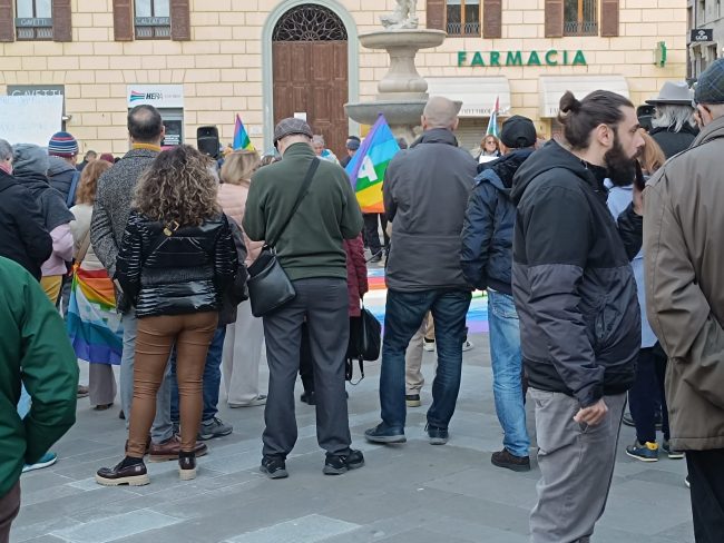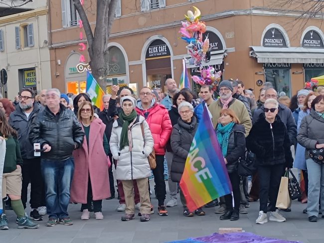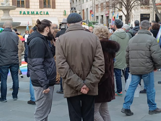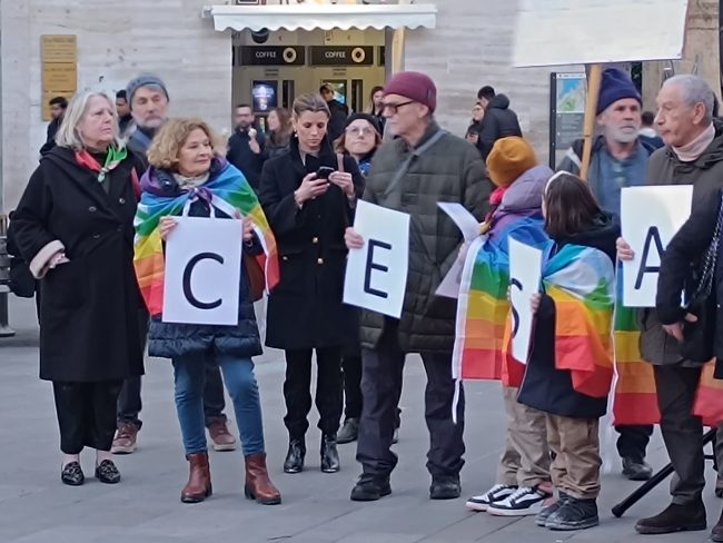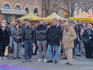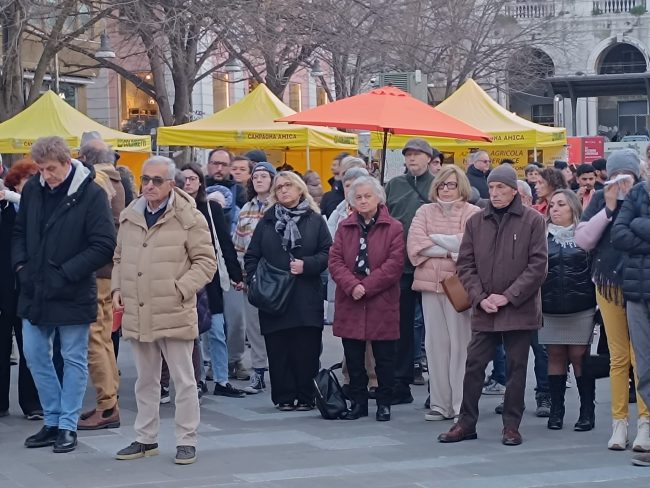 E dopo che un rappresentante dell’Anpi ha letto le letterine scritte da alcuni bambini ucraini, gli altoparlanti hanno iniziato a diffondere le note di ‘We shall overcome’ di Joel Baez e alcuni brani del repertorio di Fabrizio De Andrè, mentre la gente è rimasta in cerchio e in silenzio a gridare la propria muta contrarietà a ogni guerra e conflitto di sorta.
