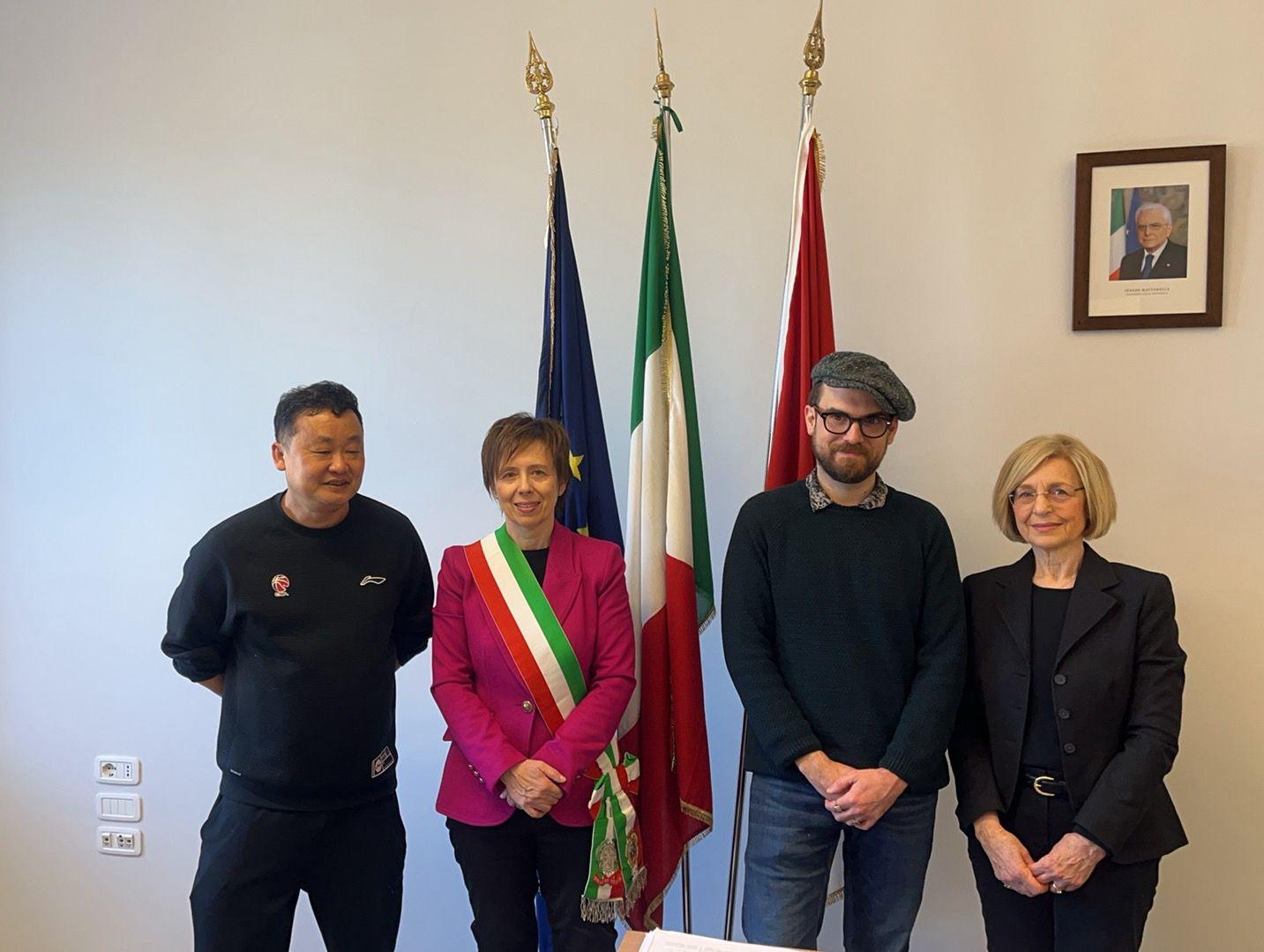 Il sindaco Daniela Ghergo e l’assessore Maura Nataloni con gli artisti Benoit e Xiaolin